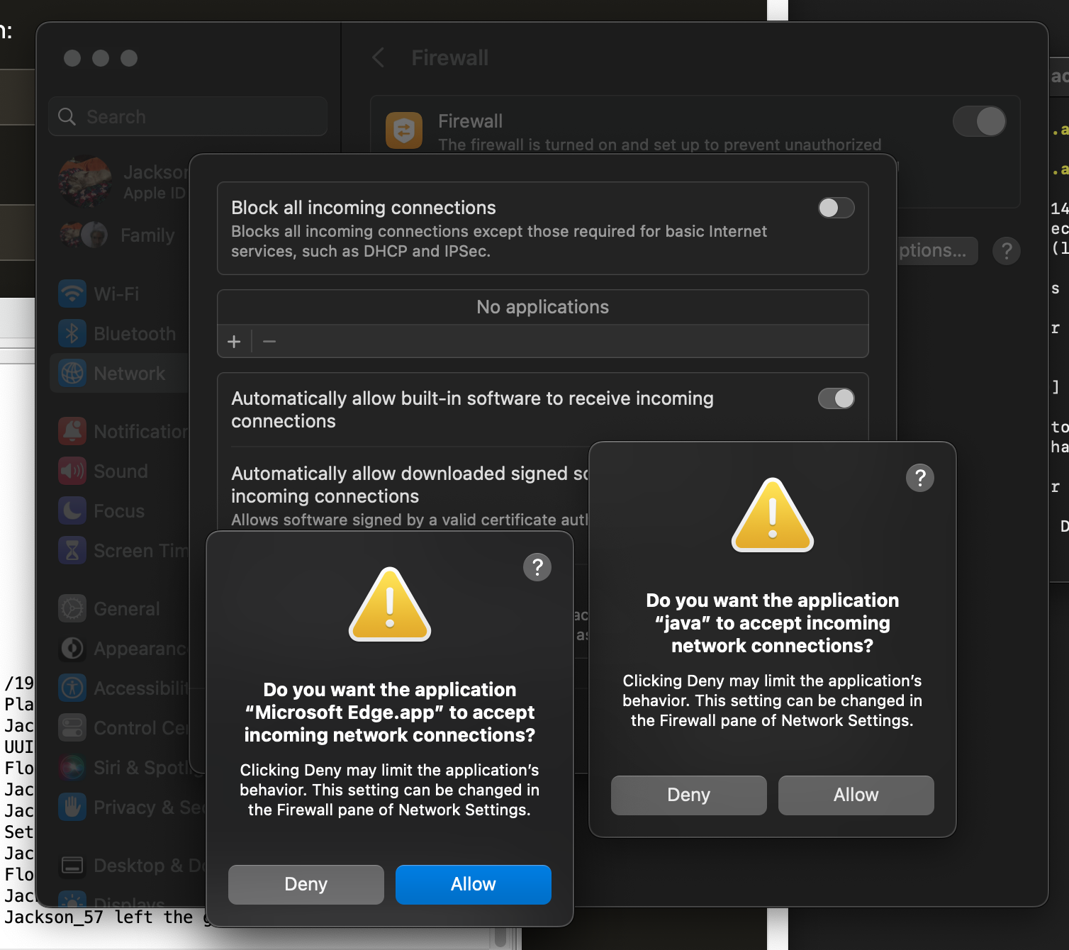 You will need to disable Block all incoming connections in your Firewall settings, as that will block any connections and won't allow you to make exceptions. To allow incoming connections, click Allow when getting these prompts. If you are still facing issues, see Apple's official guide here to open a port on macOS.