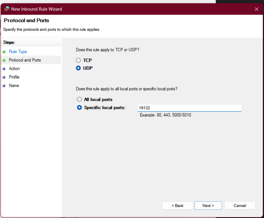5. Select "UDP" and "Specific local ports", and enter the port you want to open (in our example, 19132). Click "Next". (Example)